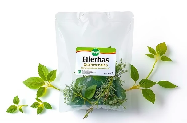 Bolsa reutilizable con mezcla de hojas de diente de león, pino y romero para infusionar agua tibia.